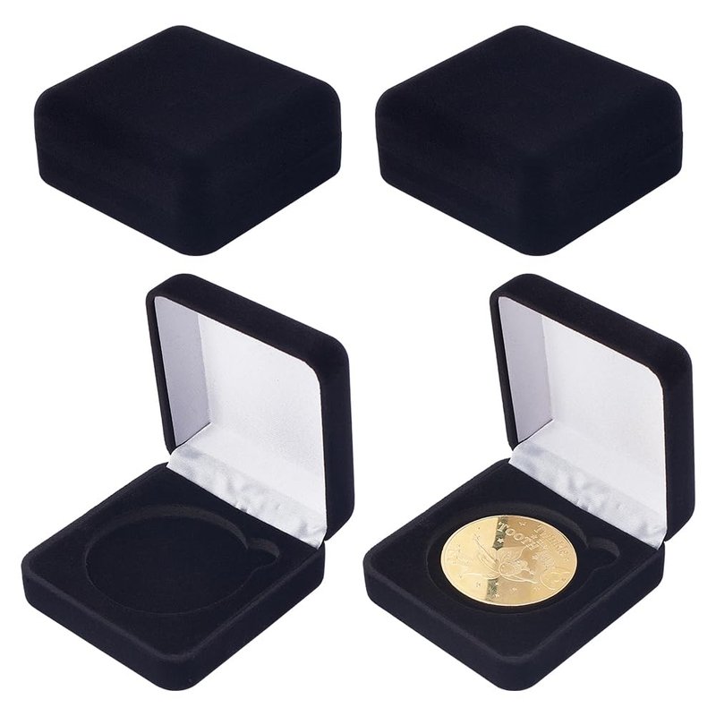 Features: - This skillfully crafted coin treasure box is exactly what you need to get your space organized. - Not only is it a functional storage and keepsake box, it is also adds a décor value to any space. Material: Velvet Color: Black Package included: 4 pieces Square Velvet 50mm Coin Presentation Display Box. Size: Whole size is about 66mm/2.58inch wide, 66mm/2.58inch long, 28mm/1.1inch high, 40mm/1.7inch inner diameter.