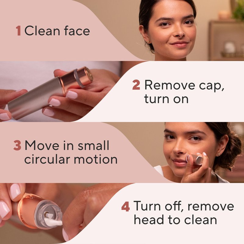 - Use the facial hair trimmer to instantly remove peach fuzz and hair from lips, chin, neck and cheeks or use as an eyebrow shaper to maintain flawless brows between, or instead of, waxing and plucking