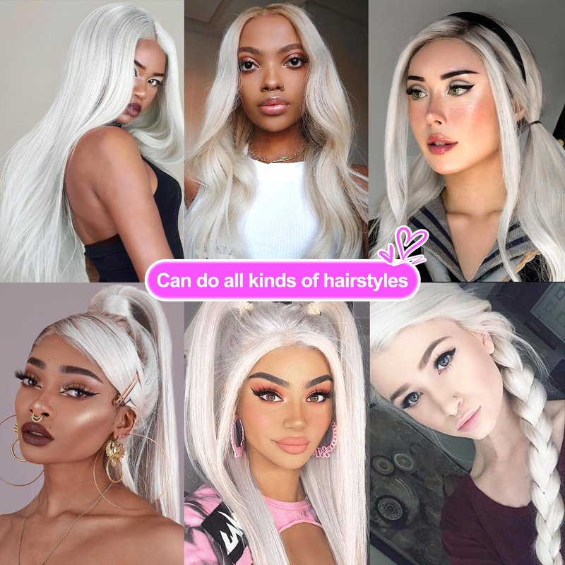 - 【Platinum Straight Lace Frontal Wig】:Platinum Colored Wigs Human Hair Pre Plucked with Baby Hair.13x4 Ear to Ear Lace Front Wigs, 4 inch Parting Space, Free Part Can Be Restyled as You Wish, Use World-Class Preferred Hair Dye Cream, Bring you Unprecedented Shiny, Silver Gray Color Human Hair May Appear Different Colors in Different Light, Suitable for Many Occasions, It Can also be a Prefect Gift.