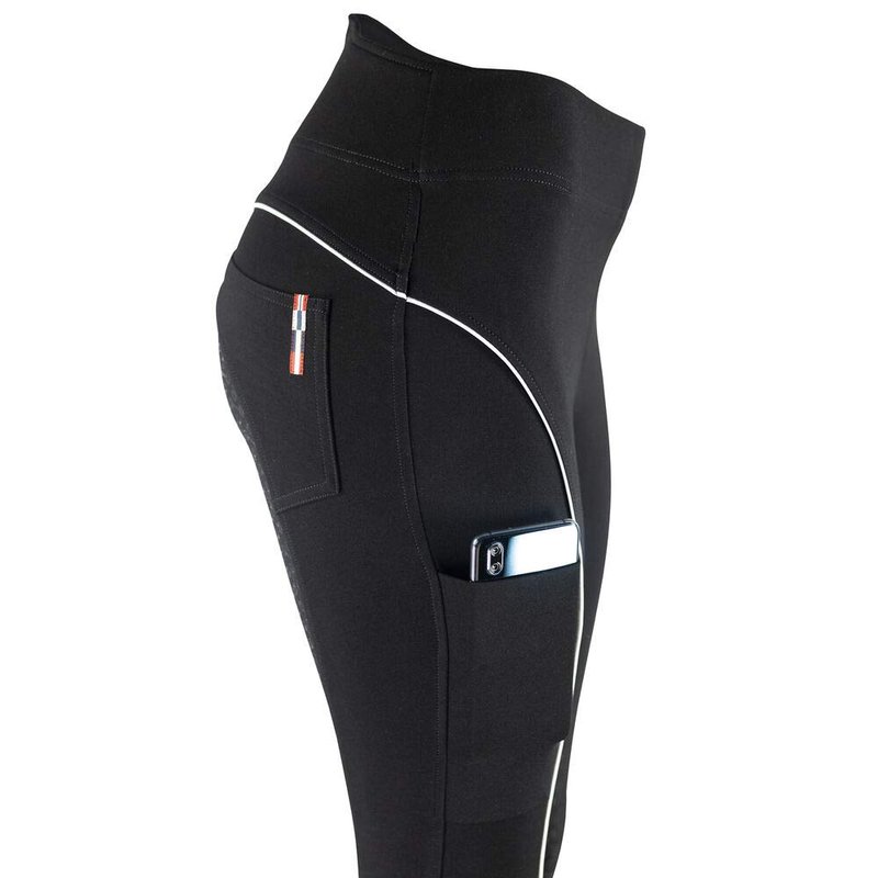 High waist tights give support and comfort during riding. A pair of pull-on tights in exceptionally soft, breathable and technical fabric. A silicone print on the inside of the legs ensures a great grip in the saddle. Specially placed piping creates a flattering and slimming look. A thigh pocket is just what you've been looking for - a place to keep your phone close to hand while in the saddle.