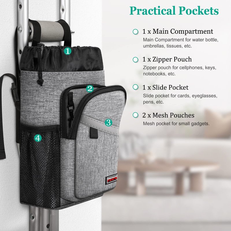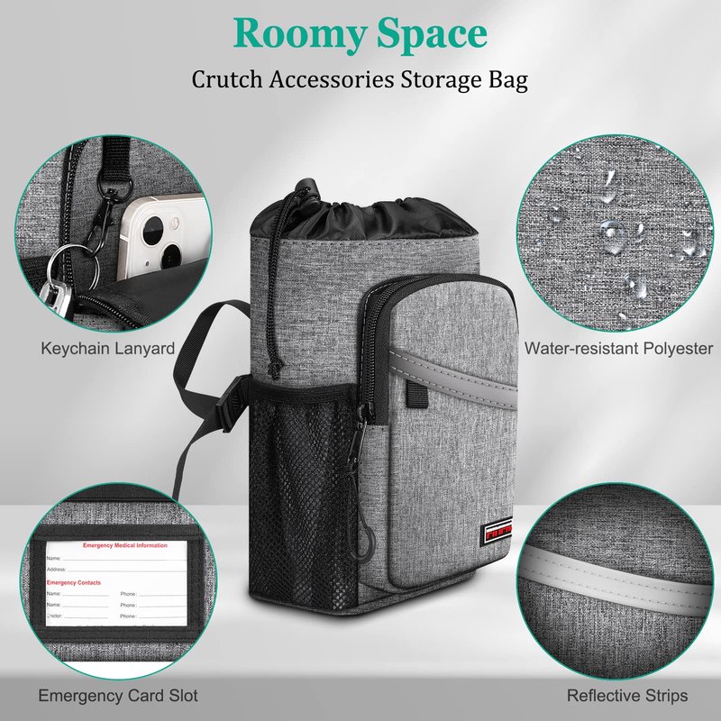 FINPAC Crutch Accessories Bag, Water-Resistant Storage Organizer Tote Bag with Drink Holder and Zipper Pouch for Crutches, Underarm Crutches Attachment - Gray