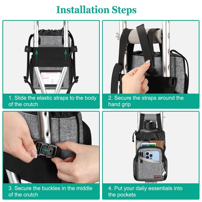 - 【Easy Installation】It comes with two adjustable straps with a secure buckle and a strong elastic band on the back to keep the bag securely on your crutches, your belongings will not hang around and hit the crutches annoying.