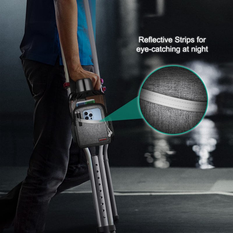 - 【Phone Holder Pouch】 The front of the crutch accessories bag is designed with a zipper pocket and a slide pocket for your cell phone between 4''-7.2'', it can also hold your keys, chargers, AirPods, cables, etc.