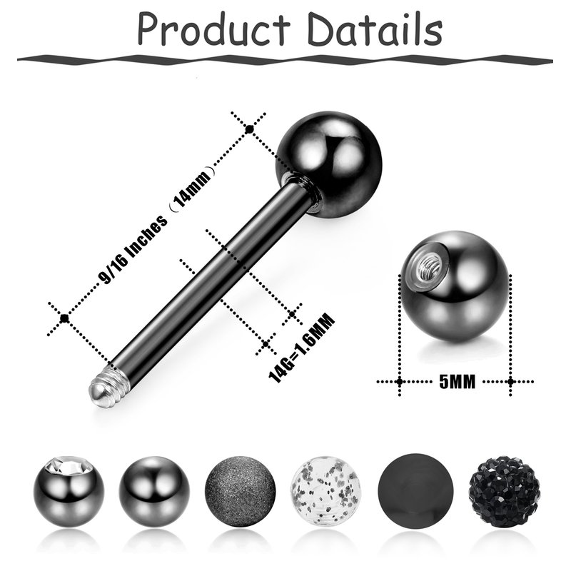 - One Set All in Same Size, Bar Thickness 14G=1.6mm; Bar Length 9/16Inch; Ball Dia:5mm, Perfect Matching People's Body.