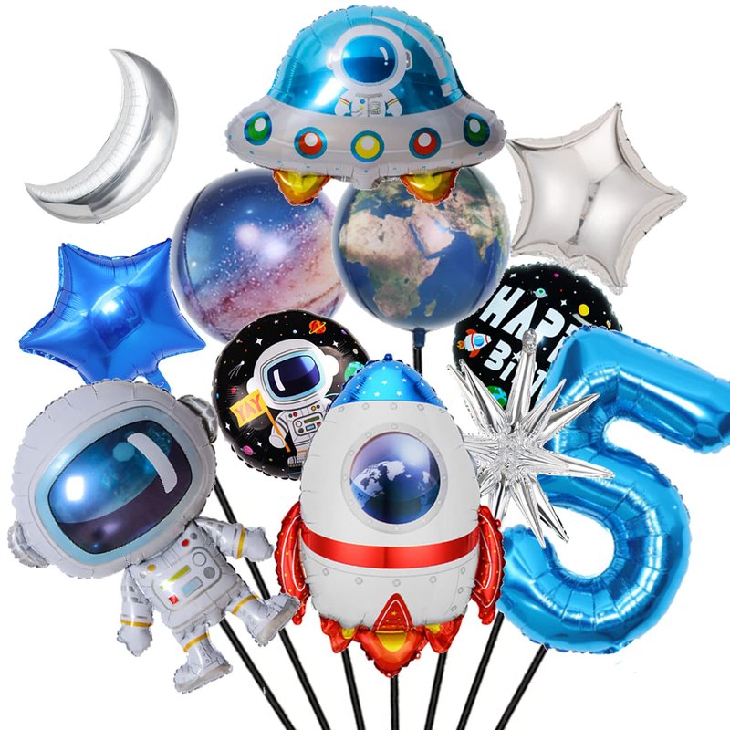Finypa 12Pcs Space Theme Birthday Party Decoration Astronaut Spaceman Foil Balloons,5th Outer Space Birthday Party Supplies,Galaxy Balloons for Boy 5 Years Old Birthday Decor