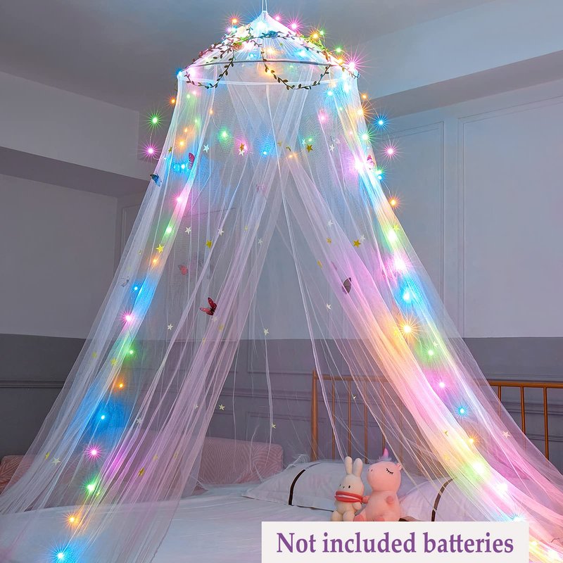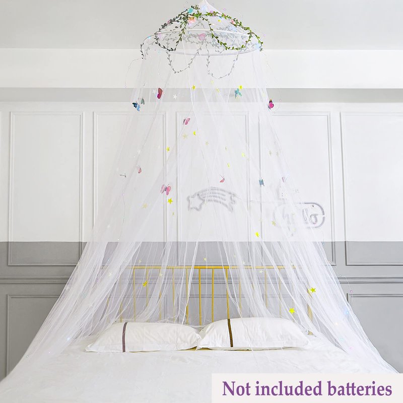 - Package Included -- 1pcs bed canopy, 1pcs sticky hook, 1 set screw and hook, butterflies and stars stickers, 10meters LED light(Battery not included), 20meters rattan. DIY girls bedroom décor, with your creativity and imagination to make your kids unique bed decor.