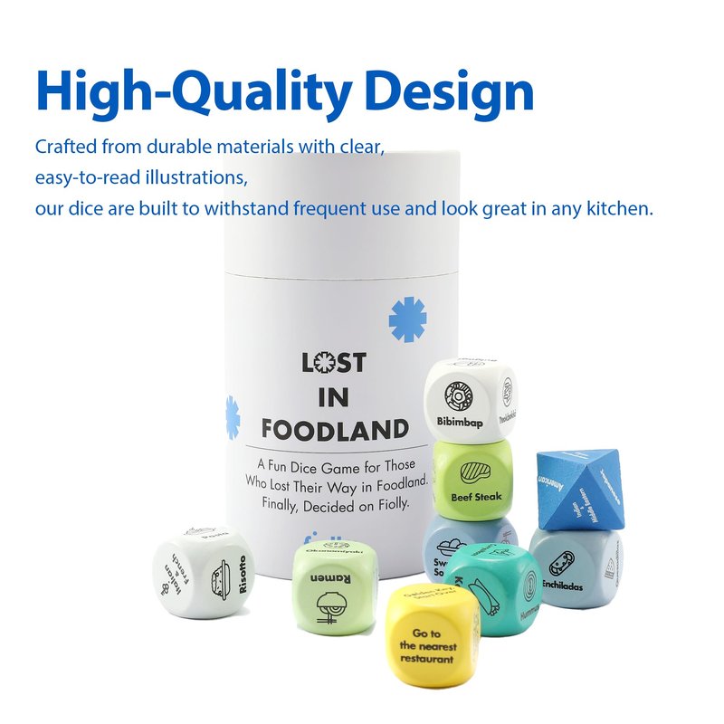 - Fun Decision Maker: Tired of the endless back-and-forth about what to eat? The Fiolly Dice Game takes the guesswork out of mealtime decisions. Simply roll the dice and let fate choose your next delicious meal. It's a playful and stress-free way to decide what's for dinner.