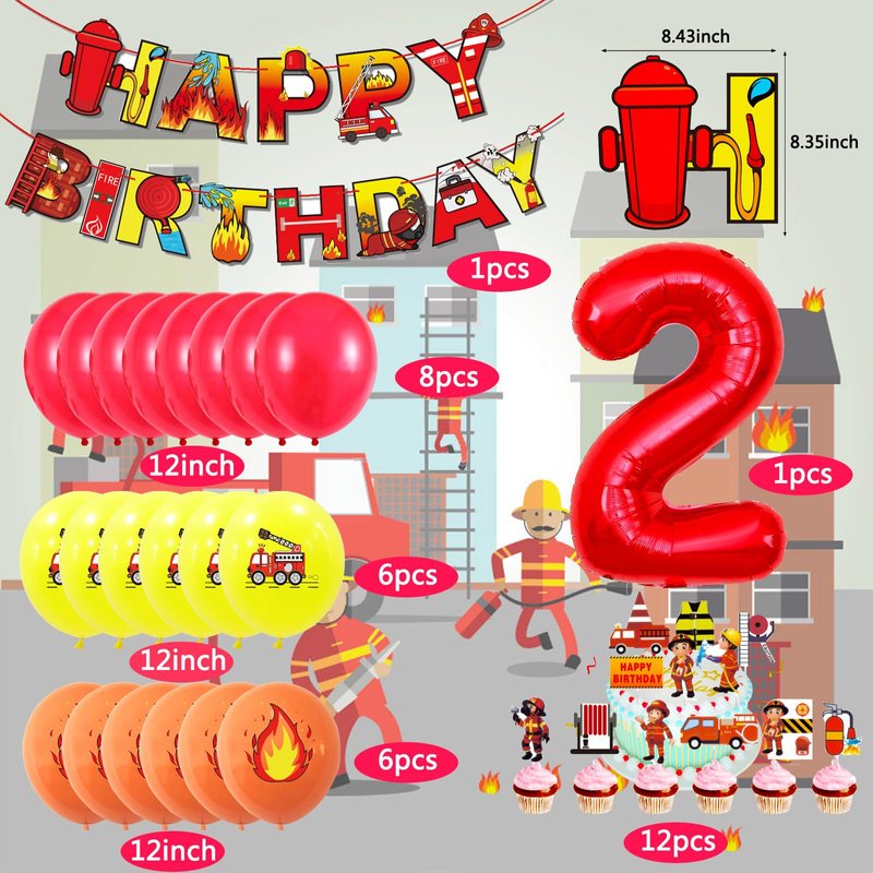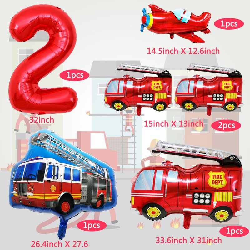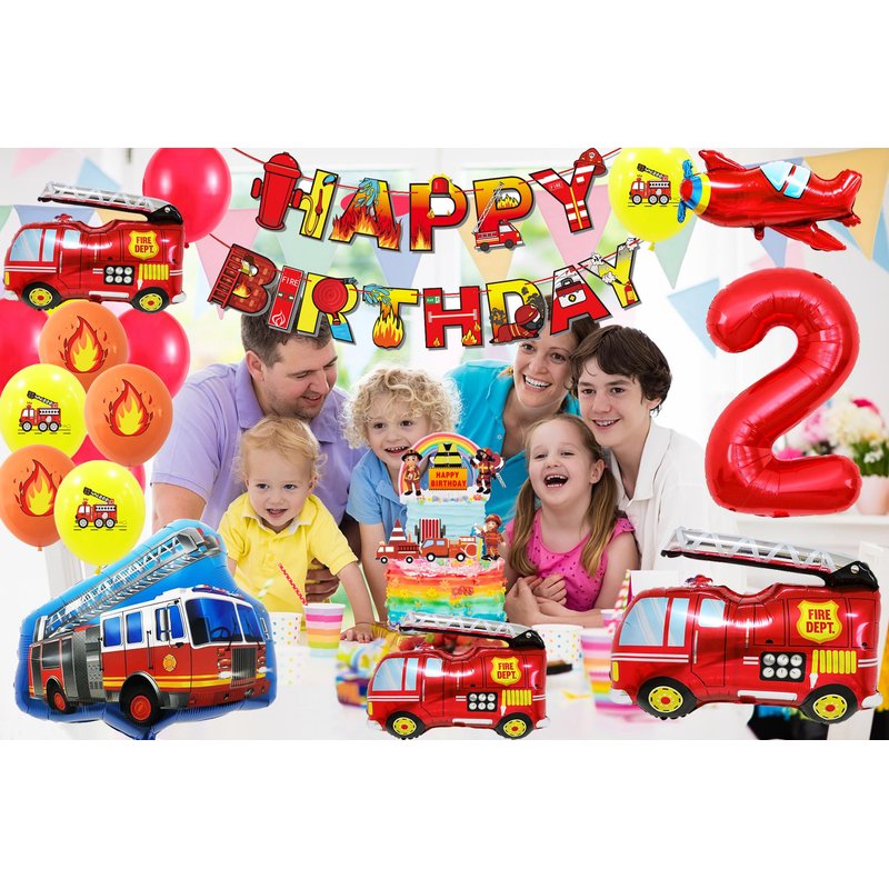 - Kids Firefighting Car Decoration Set:Firefighting Car Happy Birthday Banner,1× happy birthday Cake Decoration,1× 32in Number "2" Foil Balloon,2x XXL Fire Department Foil Balloons,2x Mini Fire Department Foil Balloons,1x Mini Retro Airplanes Foil Balloons,12x Latex Balloons with Firefighting Car Pattern, 6x Red Latex Balloons,1x Roll Band.
