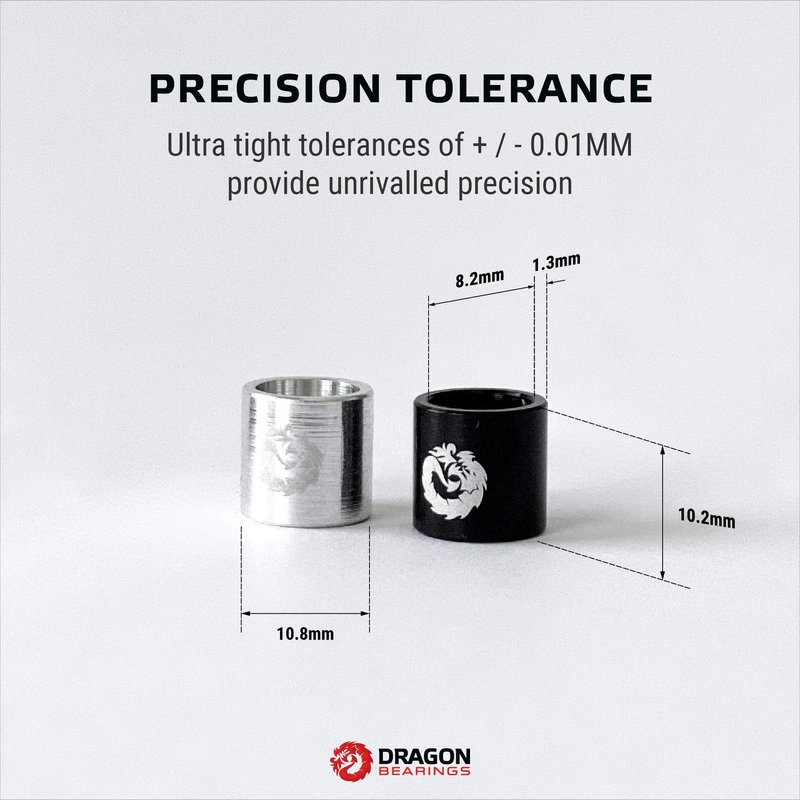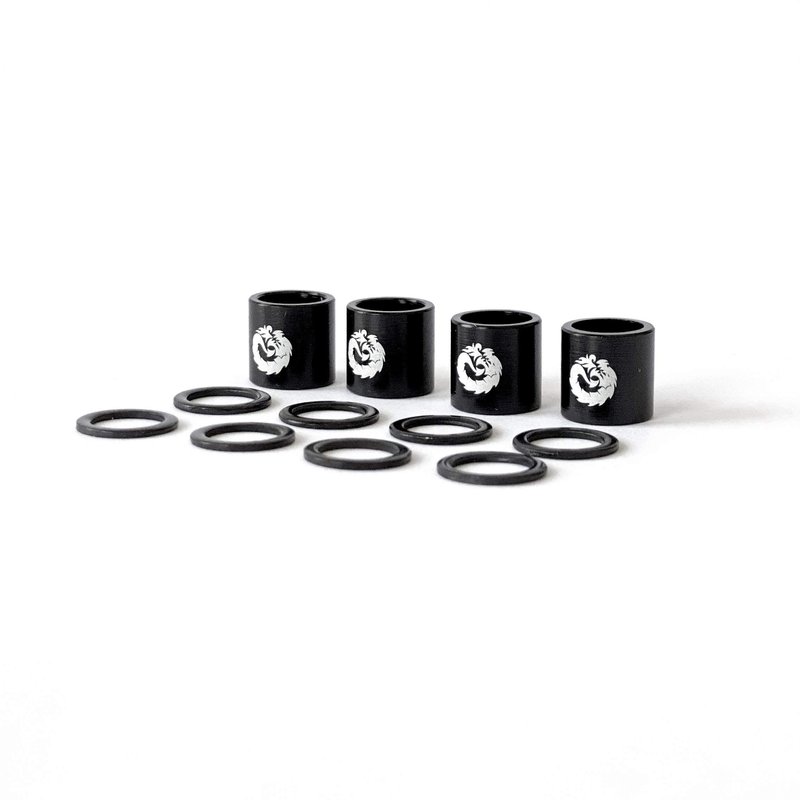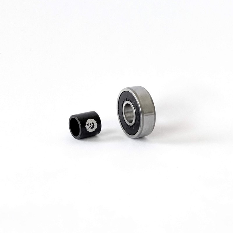 The Dragon Bearing Spacers and Speed Rings Set is made for those serious about skateboard performance. Precision tolerances of + / - 0.02mm ensure flawless fitment and super-fast bearings every time, guaranteed. Unlike most stamped metal spacers, Dragon Spacers are machined aluminum so they fit perfectly into wheels. This level of precision was previously unseen in this spacer price point. FEATURES: - Comes with 4 spacers, 8 speed rings, Beast Guarantee card, and a Dragon sticker. - Spacers are made from a light, high grade aluminum and speed rings are made from iron coated in zinc. - Extreme precision for perfect fitment on skateboards. - Increases bearing life and performance instantly. - Enough parts for 4 skateboard wheels. INSTALLATION: 1) Remove everything from the skateboard axle 2) Place a Dragon Speed Ring (small washer) on the axle 3) Place a bearing on the axle with the shield towards the middle of the skateboard 4) Place a Dragon Spacer on the axle 5) Place a bearing on the axle with the shield towards the middle of the skateboard 6) Push wheel down on the bearing with the outward part of the wheel facing towards the middle of the skateboard 7) Remove wheel and seated bearing from the axle 8) Flip wheel and place it back on the axle, installing the second bearing 9) Place a Dragon Speed Ring on the axle 10) Tighten axle nut down all the way (some clicking is often normal, bearing is fully seating into the wheel) 11) Repeat and go shred!