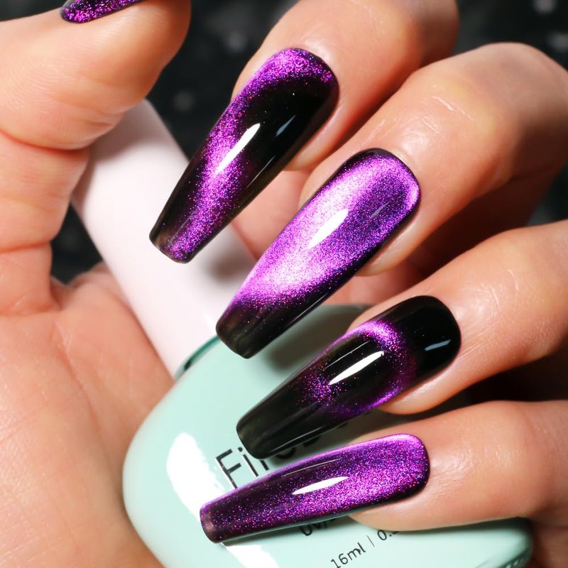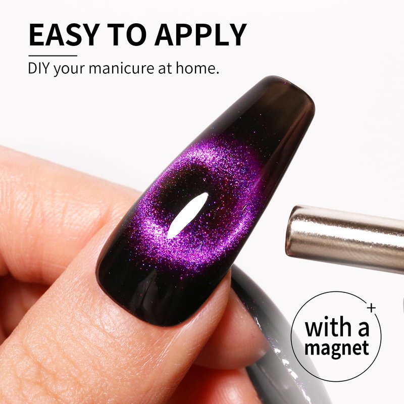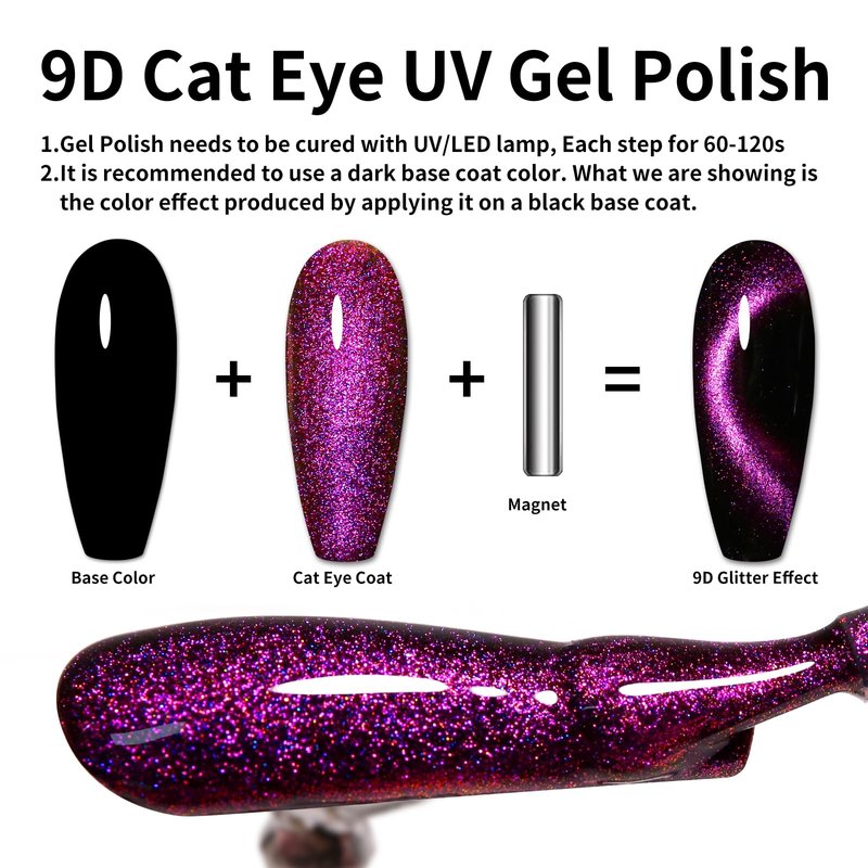 - Gorgeous Effect - Galaxy Deep Purple Cat eye gel nail polish can work with different color base to get different effect. We suggest that you use a dark base coating, and our page shows the color effect of applying cat's eye gel to the black base coating. Use the magnet stick over the nail surface about 3-5mm for 5-10 secs to create desired pattern before curing, easily to build out Galaxy cat eye holographic gorgeous effect.