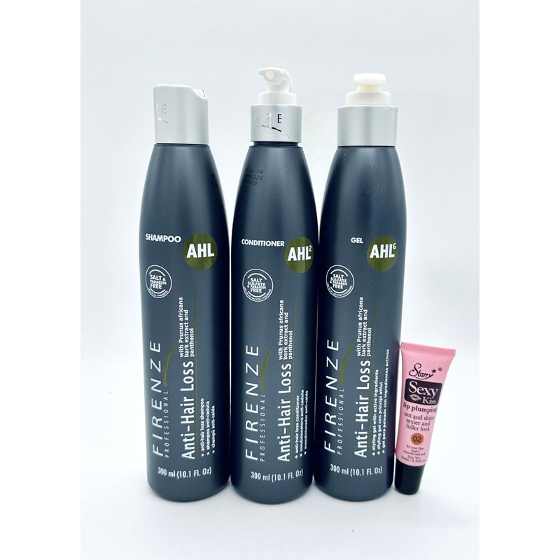 Firenze Professional AHL Anti-Hair Loss Shampoo, Conditioner and Gel 10.1 fl oz with Prunus Africana Extract & Panthenol - Free Starry Lip Plumping Gloss 10ml, Clear