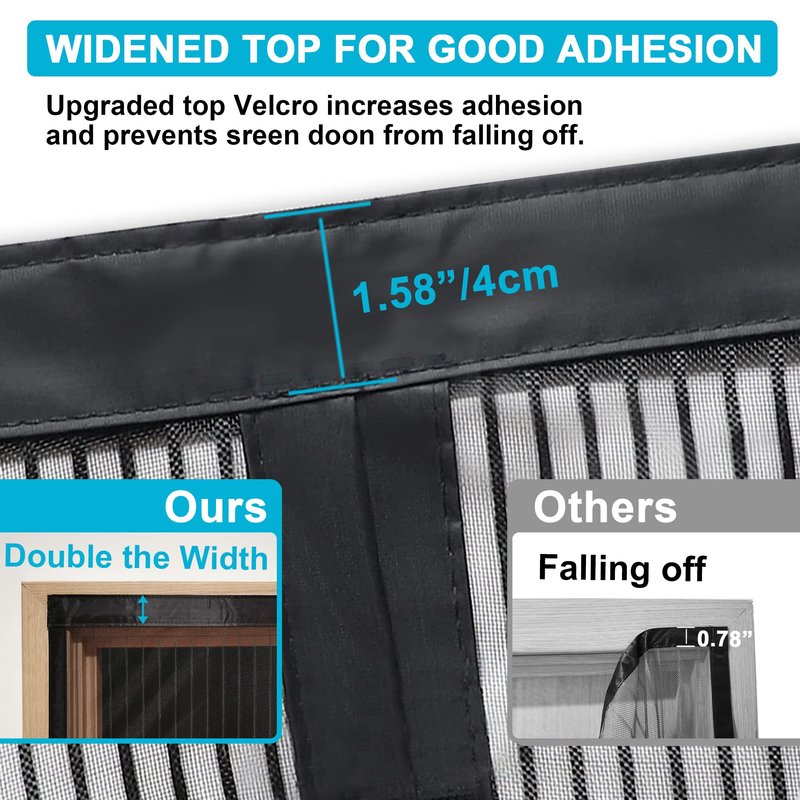 - Premium Full Frame Velcro: The door net screen with magnet is made of the full frame Magic Tape which is good for removing and rolling up during the off seasons. At the same time, with the upgraded widen 1.6 inch hook& loop on the top, the hanging magnetic screen doors for single door would always stays in its place and doesn’t fall off. Extra push pins are included for added security and strength.