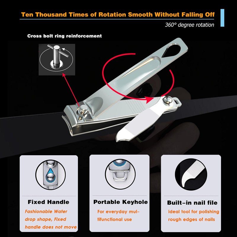 Large Nail Clippers:Stainless steel blades cut thick nails smoothly and easily. Ergonomically design to make it feels comfortable when clipping nails, no risk of tearing or splitting nails.