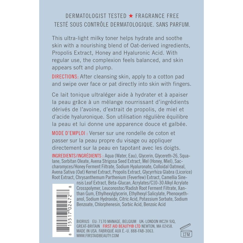 An alcohol-free, oatmeal-powered toner that hydrates, relieves and soothes skin while supporting overall skin health for a balanced complexion. Use after cleansing to hydrate and balance your skin. Oat milk, colloidal oatmeal and wild oats are combined with Honey and Hyaluronic Acid to help soothe, relieve redness and hydrate. Skin is left plump and prepped to absorb oils, serums or moisturizers. This clean formulation is allergy-tested, fragrance free and safe for sensitive skin.