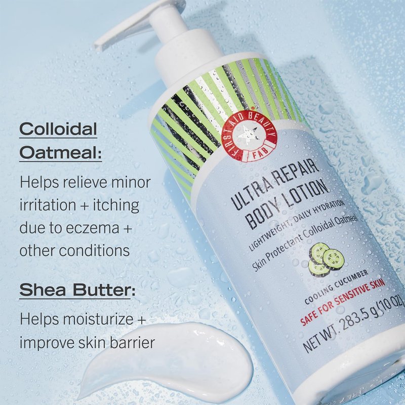 First Aid Beauty Ultra Repair Body Lotion – Lightweight, Daily Moisturizing Hydration for All Skin Types, Even Sensitive, Dry & Eczema – Cooling Cucumber, 10 oz