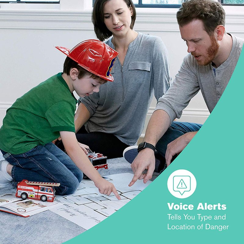 - Voice and location alert feature ensures residents are aware of the smoke or CO danger and provides the room location of where it was detected