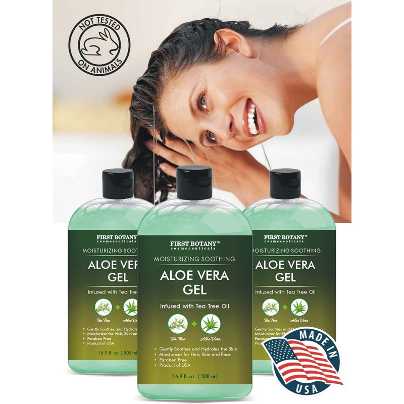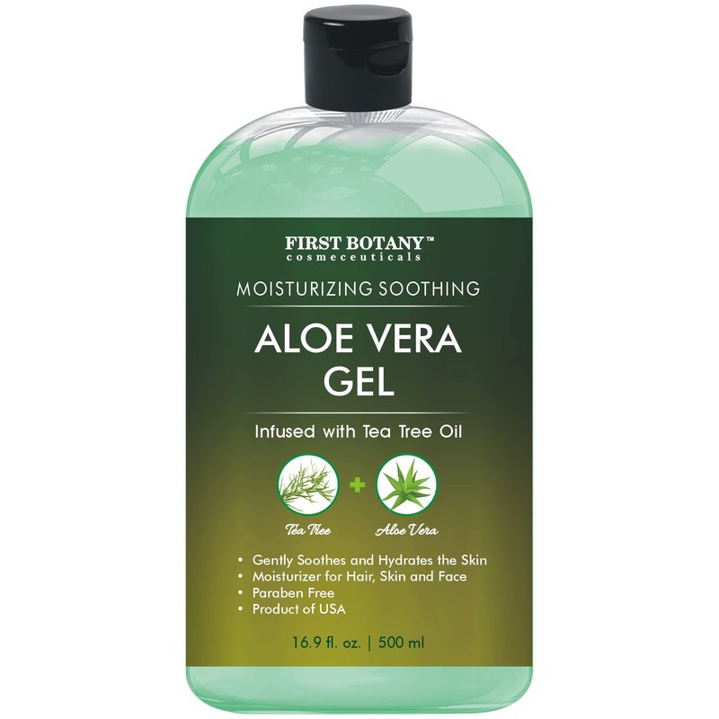 First Botany, Aloe Vera Gel from 100 Percent Pure Aloe Infused with Tea Tree Oil - Natural Raw Moisturizer for Hand Sanitizing Gel, Skin Care, Hair Care, Sunburn, Acne & Eczema -16.9 fl oz | 500 ml
