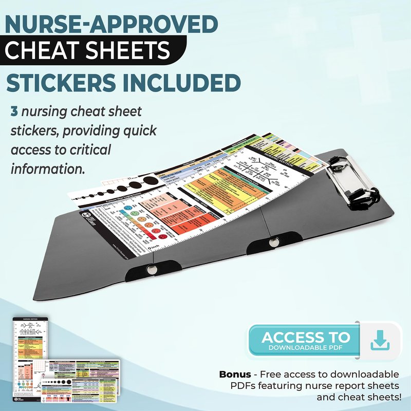 - Nurse Approved Cheat Sheet Stickers – You will receive 3 “cheat sheet” stickers and the access to downloadable PDFs, featuring nurse report sheets, medical surgical and EKG clinical cheat sheets. Whether you're a experienced nurse or a new grad, our resources will help you stay organized and excel in your next shift!