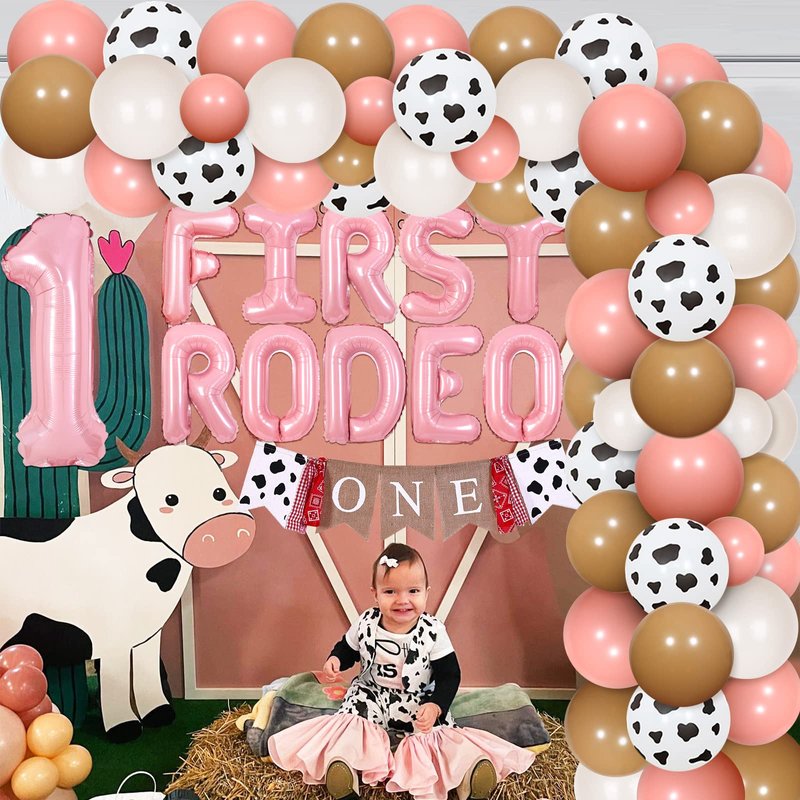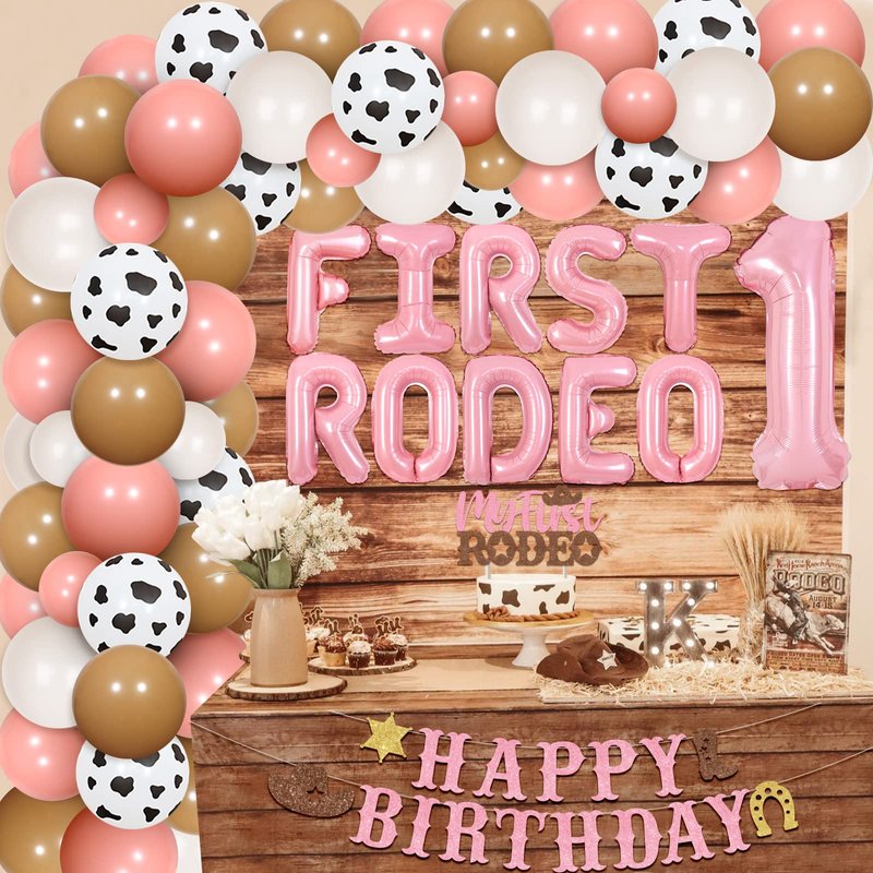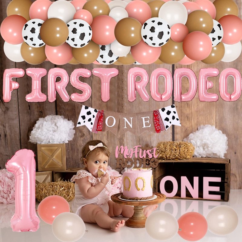 - You will receive: 1pc pink happy birthday banner, 1 set of pink first rodeo foil balloons 16inches, 1pc pink first rodeo cake topper, 1pc ONE high chair banner, 1pc pink number 1 foil balloon 32inches, 40pcs latex balloons 12inches(10 retro white, 20 vintage pink, 10 khaki, 10 cow spotted), 15pcs latex balloons 5inches(5 retro white, 5 vintage pink, 5 khaki), 5M balloon strip and 1 roll of adhesive dots.