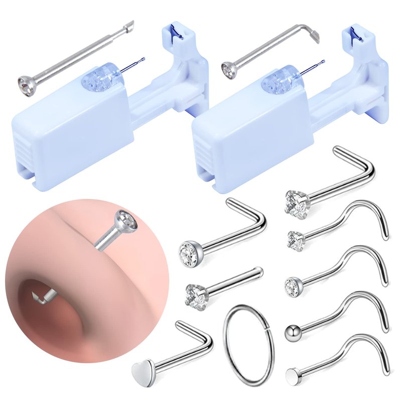 - 【Value Pack】- Medical blister package including 2 PCS individual packed nose piercing guns,5 years shelf life,2 alcohol pads and 9 pcs nose studs gifted