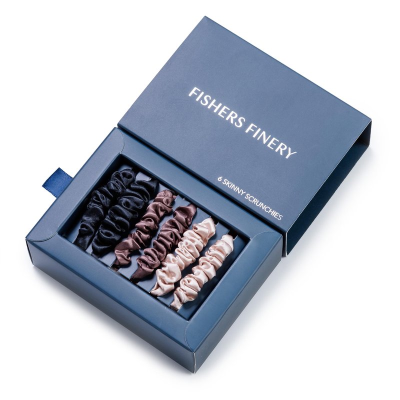 Fishers Finery 25 Momme Pure Mulberry Silk Skinny Scrunchies | Hair Tie Set for Thin Hair (Champagne|Brown|Black- 6 Pk)
