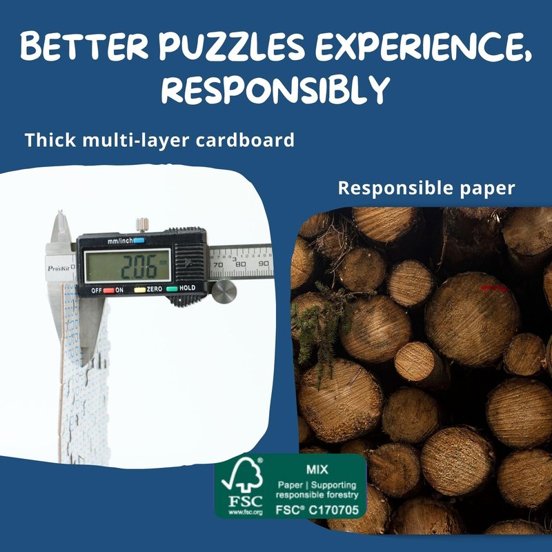 - Premium Quality and Precision Cutting: Made from high-quality materials, this puzzle features precisely cut pieces that fit together seamlessly, ensuring a satisfying assembly experience with minimal dust for a cleaner workspace