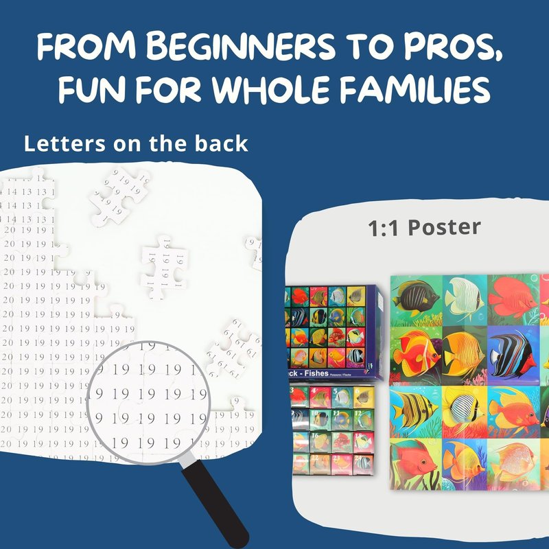 - 1:1 Poster and Letters on the back: Each puzzle includes a full-sized 1:1 reference poster and letters on the back of each piece, allowing you to visualize the completed image and choose your desired difficulty level for a tailored experience