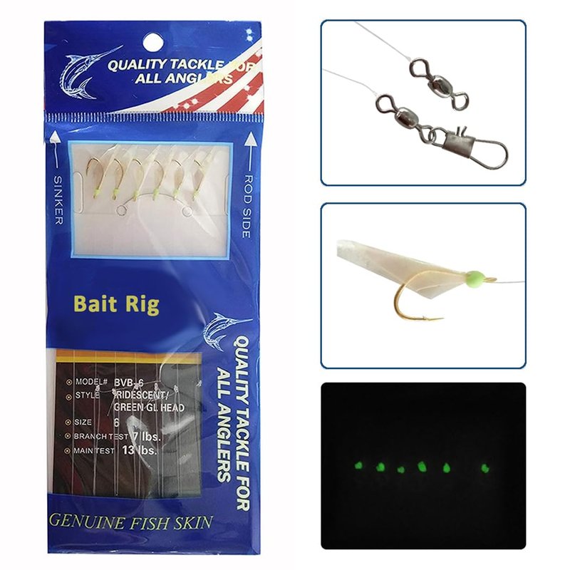 Glow Material + Real Fish Skin + Gold Hook + Nylon Fishing Line + Rolling Swivel + Fishing Swivel Interlock Snap Connector
