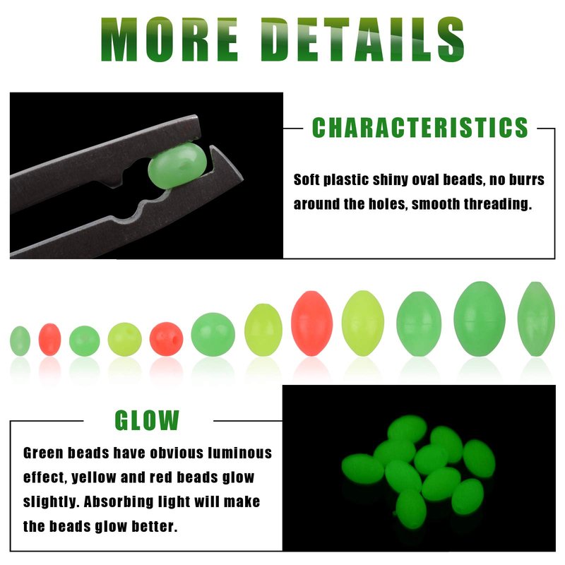 - Glow - Green beads have obvious luminous effect, yellow and red beads glow slightly. A moment's exposure to light provides better luminosity.