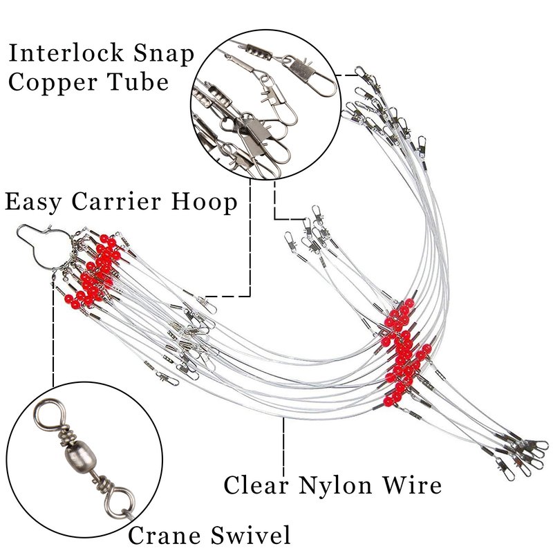 - Fishing wire leaders rigs compose with white nylon fishing wire leaders, crane swivels, interlock snaps and red beads