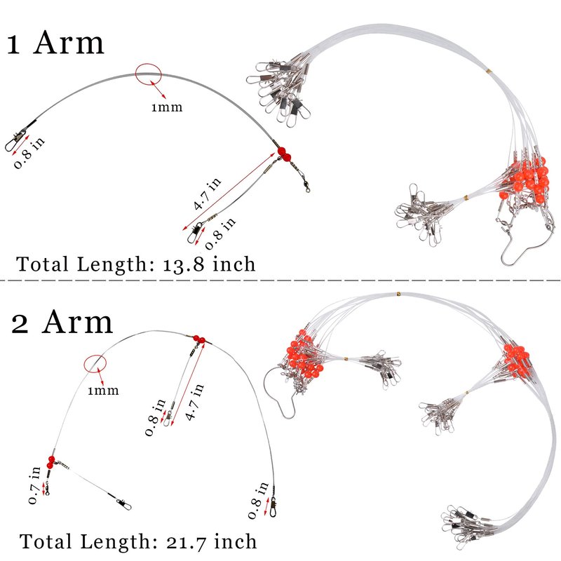 - Fishing leader length: 13.8 inch(1 arm)/21.7 inch(2 arm), 90 lbs test weight. Arms: 4.72 inch, 55 lbs test weight