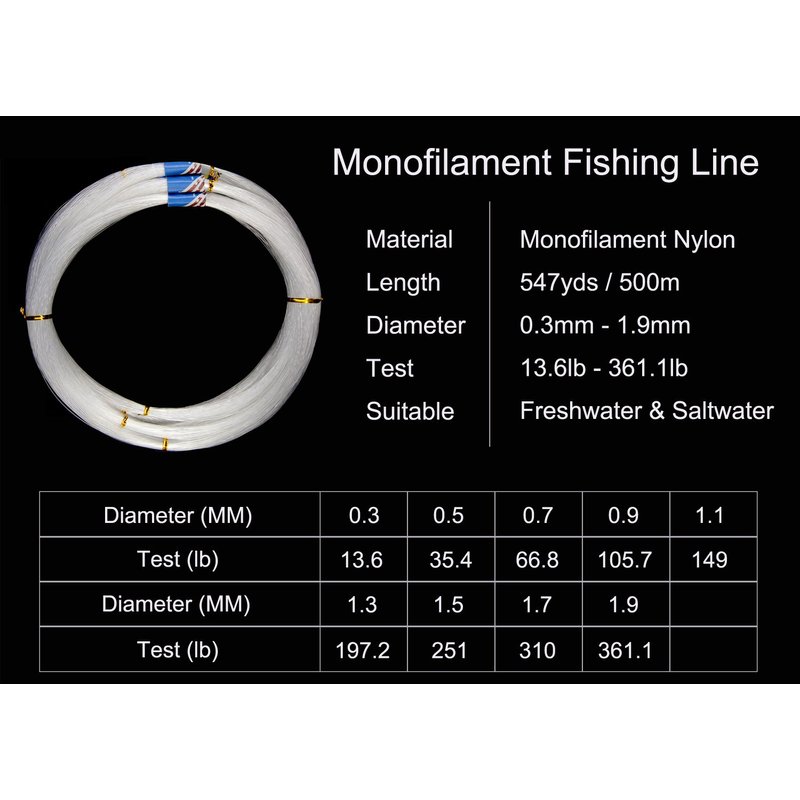 - UNIQUE PACKAGE - Our nylon mono line features quick, tangle-free availability, maximizing your efficiency while on the water. 13 – 396lb test, A WHOLE 500M THREAD ROLLED INTO FIVE COILS in one package, definitely has less memory than other lines wound on the axis.