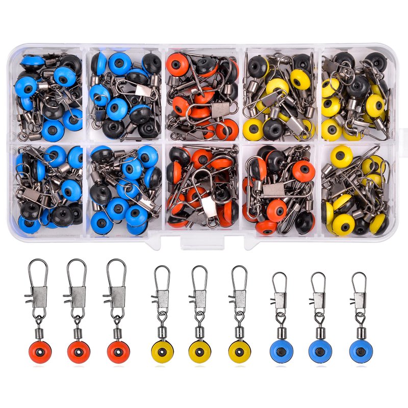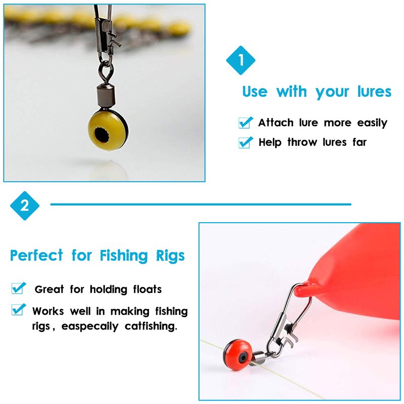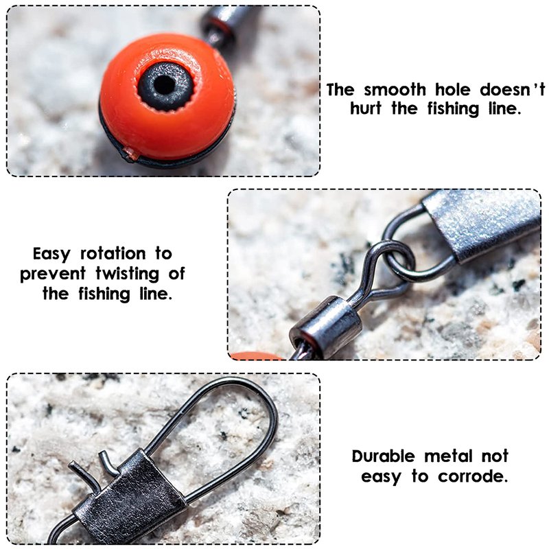 - Rolling barrel swivel with snap connector style,it has small friction and flexible rotation, effectively avoiding floating and main line winding. the bean is made of wear-resistant plastic, its smooth sliding hole doesn't hurt the line.