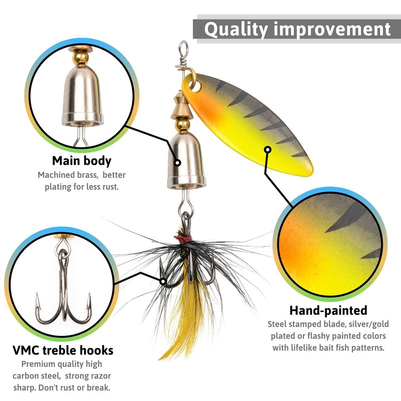 - MAXIMUM RESULTS: These life-like spinner lures are hand painted in bright, vibrant colors, being ideal for trout, bass, walleye, salmon, northern pike and other larger species. Whether in fresh or salty water, these fishing lures become simply irresistible through their natural motions.