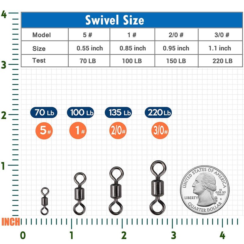 - .fishing swivels Size: 3/0, 50 pcs, test 220 lbs, we provide a one-year warranty and lifetime technical support, if you have any questions, please contact us.
