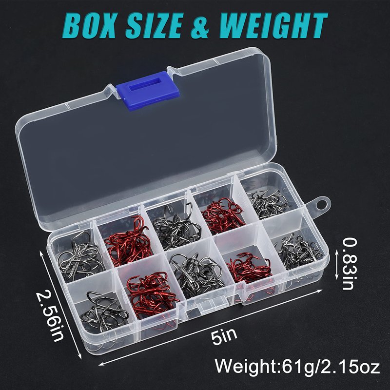 2. Treble Hooks are loaded in a re-usable plastic box, perfect gift for emergency repairs for damaged hooks on your lure.