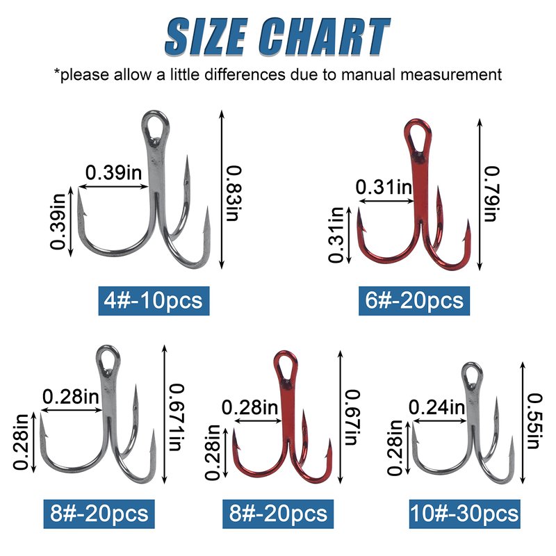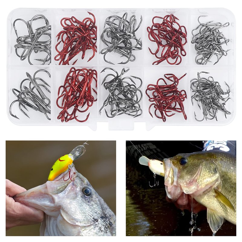 - MULTI SIZES - Black: 4# 10pcs, 8# 20pcs, 10# 30pcs Red: 6# 20pcs, 8# 20pcs Total: 100pcs sharp treble hooks in a free durable handy box. Multiple sizes for multiple fishing situations, Fit for freshwater or saltwater fishing