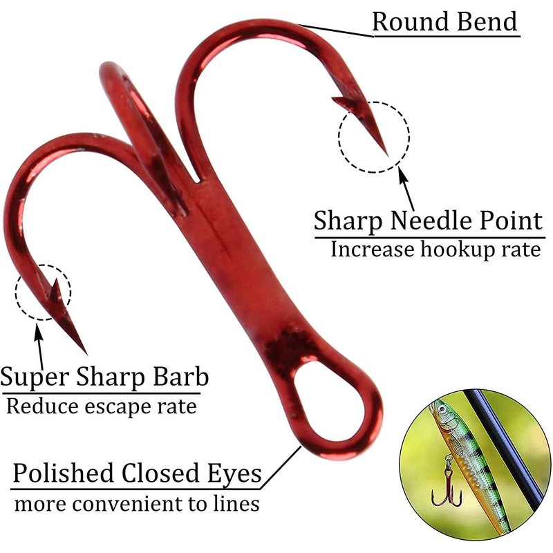 - SHARP - Treble Hooks are finished with barbs and super needle points that allow superior hook penetration through gill plates and the toughest parts of the mouth, effectively prevent fish from escaping