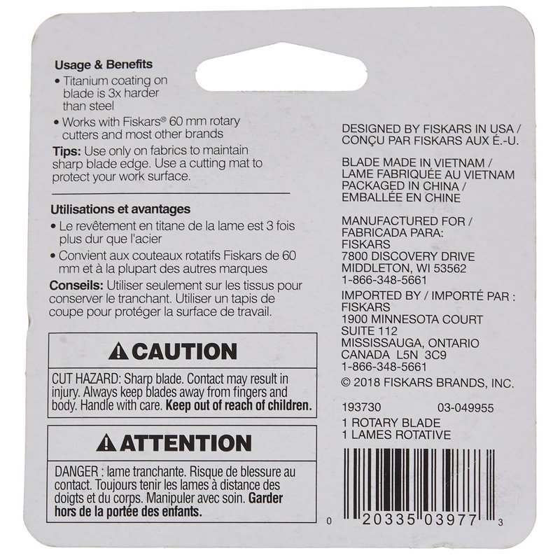 - SEWING, ARTS, AND CRAFTS STAPLE: The Fiskars 60mm Titanium Rotary Blades are designed to cut multiple layers of fabric, batting, and foam in straight lines or curves; Ideal for sewing, arts and crafts for adults