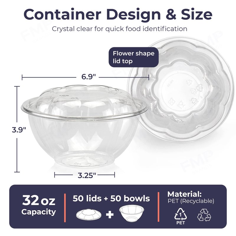 - Value Pack: The disposable salad containers with lids consist of 150 bowls and 150 lids. Each bowl has a generous capacity of 32 oz, allowing for ample servings of salads or other delicious dishes. With a top diameter of 6.9 inches, these salad shaker bowls provide enough space to comfortably toss and mix ingredients.