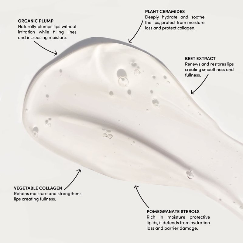 - KEY ACTIVES: Our Unique Plant Ceramides Formula Restores Lip Moisture Barrier While Protecting From Water Loss. Organic Pomegranate Plant Sterols, Beet Extract, + Vegan Collagen Improve Lip Cell Structure, Increase Lip Volume + Fight Signs Of Aging.