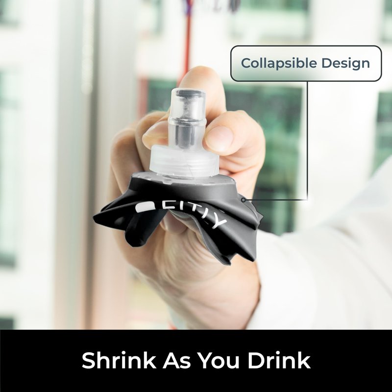 - SHRINKS AS YOU DRINK: Our collapsible water bottle is uniquely designed to shrink as you drink. This ensures the water doesn’t slosh around, bounce or rattle. The flexible design shapes to your hand & body, meaning the soft flask is never unwieldy. Our flexible water bottle features an intelligent bite valve & leak-resistant mouthpiece.