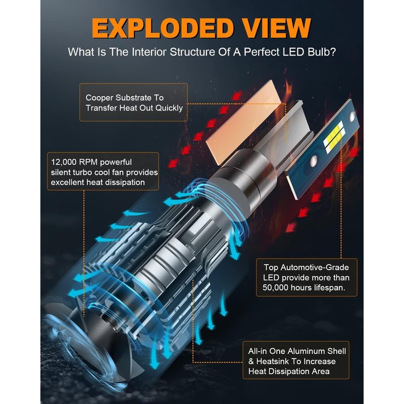 - 【Longer Lifespan with Turbo Cool Fan】- These H13 LED fog light Bulbs are built to last. They are designed with top-grade materials and a heat sink that exceeds minimum heat-transfer requirements. The 12,000 RPM turbo cool fan provides excellent cooling ability, ensuring superb performance and a lifespan of over 50,000 hours. Drive with confidence, knowing that your bulbs will stand the test of time.