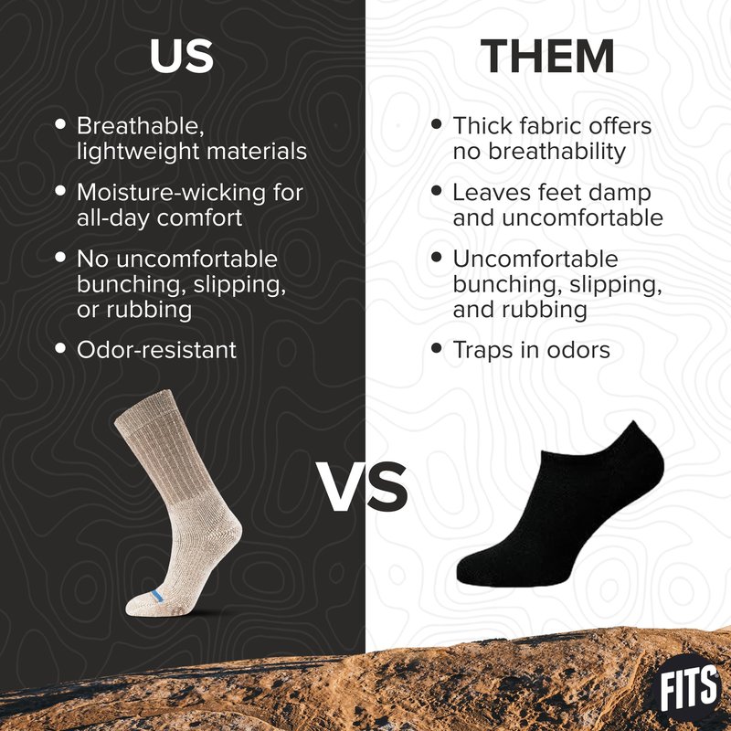 Experience unparalleled comfort and durability with the Light Rugged crew socks by FITS, designed for men and women seeking the perfect balance of comfort and durability in their daily footwear. These socks, made from premium merino wool, offer unrivaled support and cushioning, whether on a construction site, hitting the sports field, or blazing a trail in your hiking boots. Our crew socks, crafted with moisture-wicking material, effectively keep your feet dry, regardless of the intensity of your activity. The breathable fabric adds to their comfort, ensuring freshness throughout your busy day. With our patented Full Contact Fit that perfectly hugs the contours of your foot, these crew socks ensure a secure and firm fit in your shoes, eliminating the worry of slippage. This precise fit eliminates loose fabric, reducing discomfort and potential rubbing, ensuring a seamless wearing experience from dawn to dusk. At FITS, we understand that active zones such as the toe, arch, and heel need extra protection. Our crew socks feature added cushioning in these critical areas. This additional padding provides the perfect blend of comfort and protection during those long days on your feet. With built-in odor-resistants, our crew socks stay fresh, making them ideal for strenuous work days or workouts. Embrace the blend of durability and comfort our Light Rugged crew socks offer. Their exceptional features make them a reliable choice for active individuals.