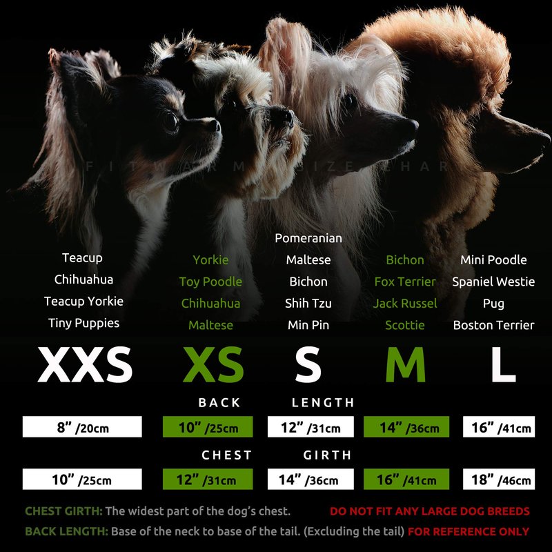 - FOR SMALL DOGS OR CATS. Please priority follows the chest size. Size Medium, fits 14" back, 16" chest. Recommended for: Bichon Frise, Shih Tzu, Havanese, Fox Terrier, Jack Russell, Scottie, Pug, Poodle, Miniature Dachshund, Italian Greyhound, Westie, Boston Terrier, Maltipoo, Sphynx, and Cavalier King Charles Spaniel.