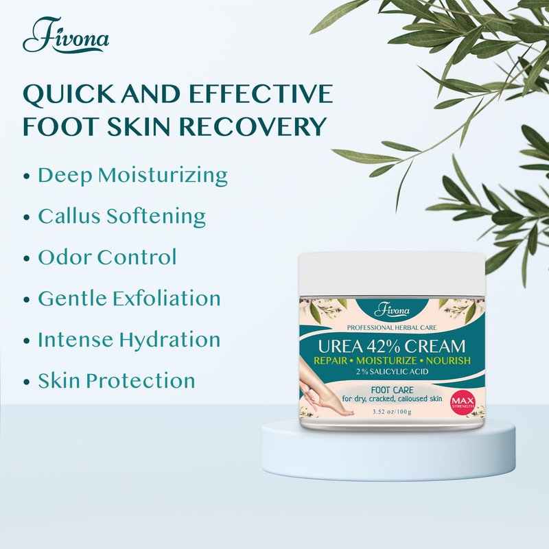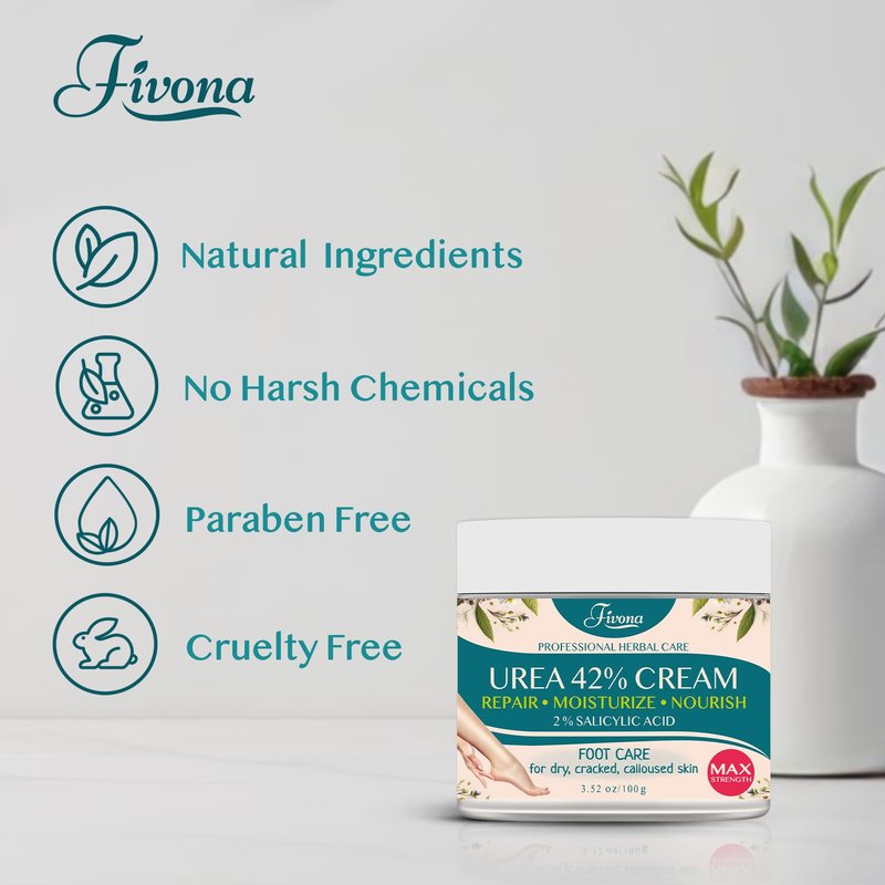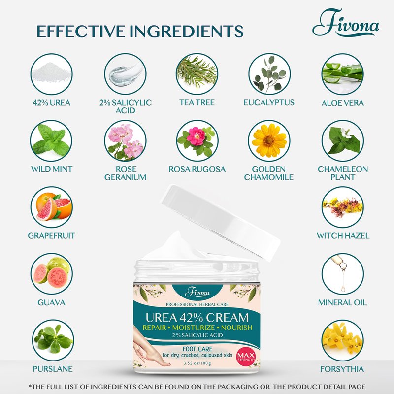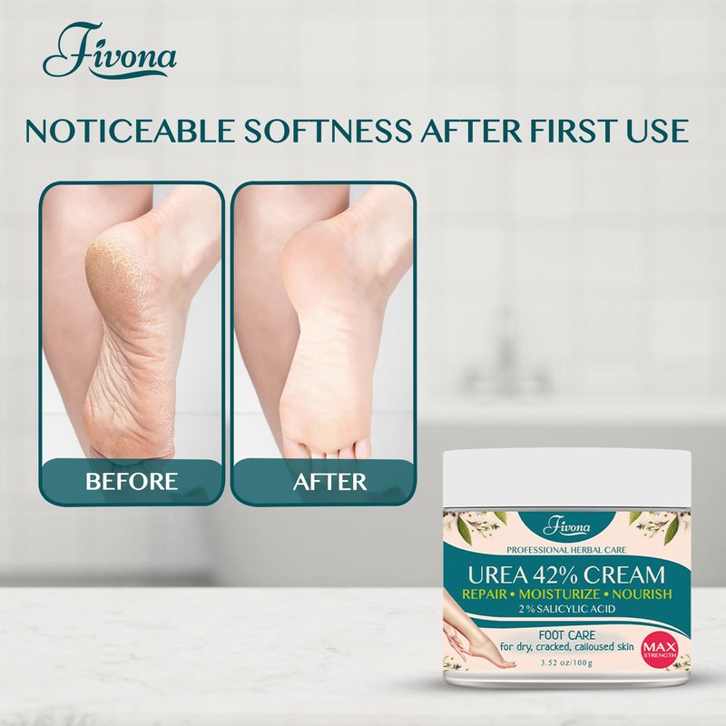 - Nourish and Soften Your Feet - Experience the ultimate relief for rough, cracked skin with our specially formulated 42% Urea Foot Cream enriched with 2% Salicylic Acid, Tea Tree, and Aloe Vera Extract. Fivona Foot Cream deeply moisturizes and hydrates dry skin.