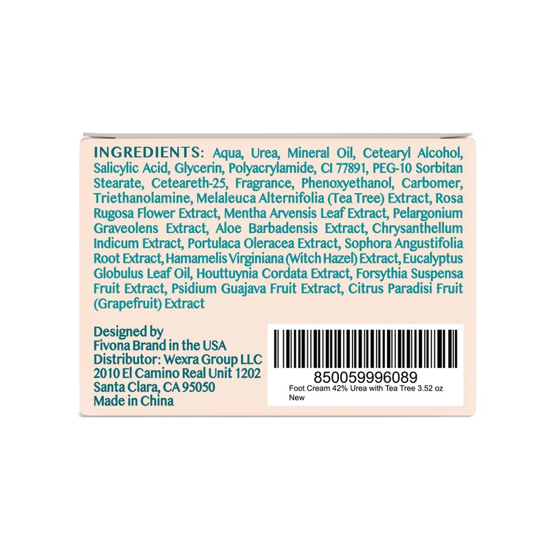 Elevate Your Foot Care Routine with Fivona Foot Cream 42% Urea with Tea Tree and Aloe Vera Extract. Infused with soothing and calming ingredients, our foot cream instantly relieves itchiness and discomfort, offering immediate relief to tired and irritated feet. Deeply moisturize and soften feet with powerful humectant ingredients: Urea helps to deeply moisturize and hydrate rough, cracked skin, promoting softness and improving the skin's barrier function, which is important for retaining moisture and protecting against external irritants. Salicylic acid is often used to soften and remove calluses and corns. Its exfoliating properties help to break down thickened, hardened skin, making it easier to manage and reduce common foot issues. Tea tree Extract has soothing properties that can help alleviate minor skin irritations and discomfort. It is a natural cleanser for the skin, helping to remove impurities and maintain cleanliness, particularly in areas prone to sweat and moisture buildup. Aloe vera is a natural moisturizer, that helps to hydrate and soften the skin on the feet, making it particularly beneficial for dry or cracked heels. Other powerful ingredients are Rosa Rugosa Flower Extract, Corn Mint Extract, Chrysanthemum Extract, Witch Hazel Extract, Guava Fruit Extract, and Grapefruit Fruit Extract. Proper foot care helps prevent foot pain and discomfort, allowing you to move comfortably and carry out daily activities without hindrance. Fivona Foot Cream creates a protective barrier that shields your skin, helping to prevent future dryness and discomfort, and ensuring that your feet remain healthy and nourished over time. Indulge your feet with the Fivona Foot Cream. This premium foot cream is meticulously crafted with a potent blend of ingredients, including 42% urea, tea tree, and aloe vera, to deliver intensive moisturization and nourishment for your feet.
