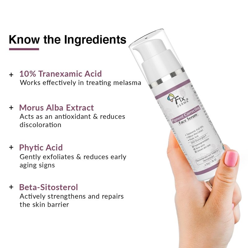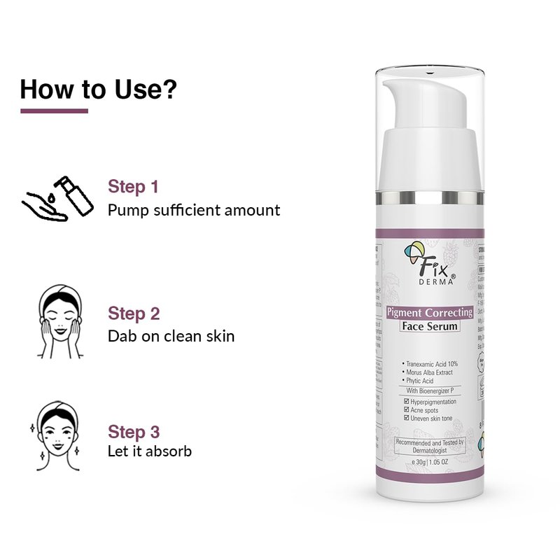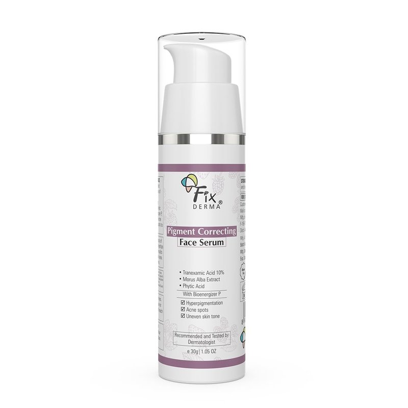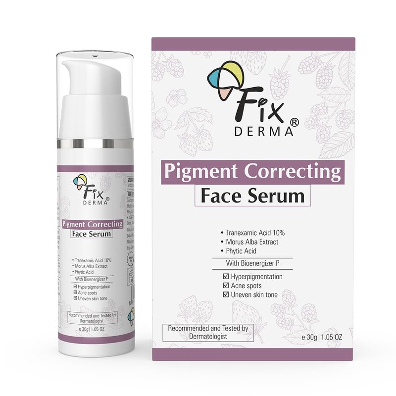 Fixderma Pigment corrector serum is a powerful formulation that helps visibly correct the appearance of dark spots and uneven skin tone. Formulated with an overpowering combination of Tranexamic Acid, Phytic Acid, Morus Alba Extract, and Bioenergizer P, the serum reduces discoloration and acne scars, while reducing future dark spots to brighten the skin complexion. Our Pigmentation Correcting Serum is formulated with scientifically proven and active key ingredients such as 10% Tranexamic Acid, Morus Alba Extract, Phytic Acid, and Bioenergizer P that targets hyperpigmentation, acne scars, melasma, and dark spots. These ingredients work by inhibiting the production of melanin, the pigment that gives color to the skin. Additionally, the serum is recommended and tested by dermatologists. The efficacy of these ingredients in reducing hyperpigmentation has been demonstrated in clinical studies. Therefore, this Pigment Correcting Face Serum is a scientifically sound option for those looking to reduce the appearance of hyperpigmentation.