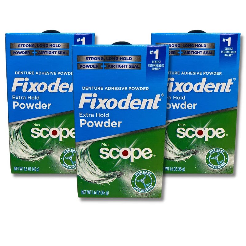 - Fixodent Extra Hold Powder Plus Scope, Pack of 3 is a top-quality denture adhesive that provides a strong and long-lasting hold, making it a reliable solution for denture wearers