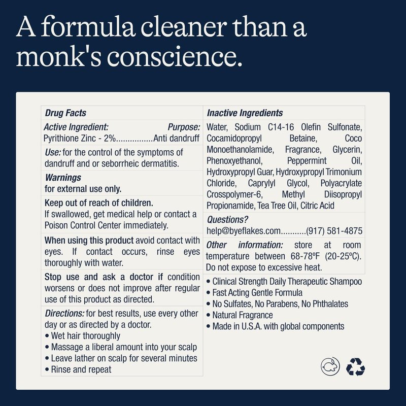 - A Formula Cleaner Than a Monk's Conscience: No sulfates, no parabens, no PEGs, no harsh ingredients that actually make dandruff worse. We designed a formula to stop dandruff and strengthen hair because no one should be worried about hair loss, a flaky scalp, or wearing black shirts.